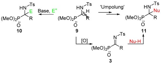Next, in view of the efficient protocol achieved for the aza-Reformatsky reaction, we focused our efforts on the extension of the reaction to the use of several α-ketiminophosphonate substrates 3. In this regard, we considered the synthesis of α-iminophosphonate substrates 3 from a formal oxidation of tertiary aminophosphonates 9. Then, the subsequent addition of a nucleophile species would afford tetrasubstituted aminophosphonates 11. Therefore, this synthetic approach can be considered globally as a route for the generation of tetrasubstituted α-aminophosphonates by the substitution of hydrogen in a trisubstituted α-aminophosphonate by a nucleophilic reagent and the complementary process (‘umpolung reaction’) to the typical electrophilic substitution of trisubstituted α-amino-phosphonates 9 leading to functionalized α-aminophosphonates 10 (Scheme 3).