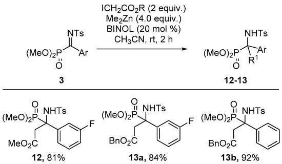 Next, the synthetic procedure was extended to the use of other different alkyl iodoacetates. The reaction using methyl iodoacetate and a p-fluorophenyl substituted α-ketiminophosphonate affords the corresponding tetrasubstituted α-aminophosphonate 12 an excellent yield (Scheme 5). Under the same conditions, the reaction using benzyl iodoacetate efficiently yields the benzyl-protected analogs of aspartic acid 13a–b (Scheme 5).