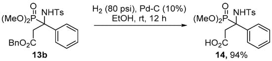 In order to obtain the carboxylic acid and/or phosphonic acid derivatives of the aspartate analogs, the hydrolysis of the obtained substrates was attempted. However, under acidic or basic treatment, compounds 7a, 12 or 13b led to the formation of complex mixtures. On the contrary, the treatment of benzylester 13b under hydrogen pressure in the presence of a palladium catalyst afforded the corresponding carboxylic acid 14 an almost quantitative yield (Scheme 6).