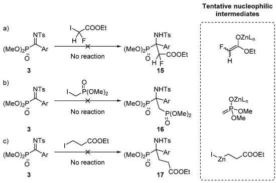 Reaction conditions as shown in the Scheme 5. (a) Reaction with α-fluoroiodoacetate. (b) Reaction test with α-iodophosphonate. (c) Remote reformatsky reaxction.
