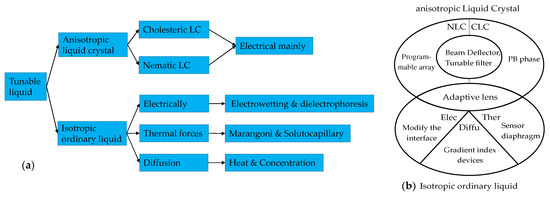 Currently, the core liquid mainly includes anisotropic liquid crystals and isotropic ordinary liquids. Liquid crystal materials are widely used, especially in the field of biochemistry. In 2022, Sulayman A. et al. [4] reviewed the applications of liquid crystals as biosensors for molecules [5], protein or peptide detection [6,7,8,9] and disease biomarkers [10]. The liquid crystal materials can also be found in the fields of optical [11,12,13], new energy [14] and the physical [15,16]. The wide application of liquid crystal materials is closely related to the continuous development of liquid crystal molecules. Liquid crystal materials have grown from nothing, from nematic liquid crystals to cholesteric liquid crystals doped with azobenzene chiral molecules [12,13,17,18,19], to the discovery of various derivative liquid crystal materials such as PDLC, SPLC and LCE, with the liquid crystal solubility and helical twisting ability improving [11,20,21]. Based on the liquid crystal molecules, the tuning performance of electrically controlled liquid crystal devices can be guaranteed gradually. There are review articles that explain the types and development of some typical liquid crystal devices and liquid devices before then. In 2018, Yi-Hsin Lin [22] systematically introduced the classification and comparison of adaptive liquid crystal lenses. Shin-Tson Wu et al. [23] summarized the principle of the LC beam steering device and the research progress over the past 19 years. Wang Lei [24] briefly described the research status of liquid crystal materials and devices in the field of terahertz and discussed the development trend of the combination of liquid crystal technology and terahertz technology. Zepeng Zhou [19] gave a comprehensive review of flexible LCP technologies covering electric circuits, antennas, integration and packaging technologies, front-end modules, MEMS and biomedical devices. Dissimilar to LC, due to the isotropic characteristics of ordinary liquid, tunable controls are more focused on the interface control of immiscible liquids. In recent years, devices that use the external environment to control the refractive index profile of liquids have gradually become a research hotspot, mainly including electric control and temperature control. The commonly used liquid includes ethanol and glycol because of their appropriate relative permittivity and stable properties. There are also good review articles in the research of ordinary liquid devices, including the summary of in-plane optical fluid tunable liquid lens in 2018 [25]. To make it easy to sense, the principle has been figured out (see Figure 1a), and the common and unique types optical devices are also summarized (see Figure 1b). Specific details about the principle will be illustrated in next section.