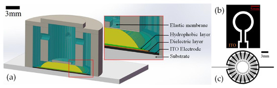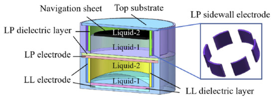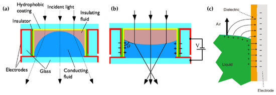 When the two-phase fluid is in contact with the cell wall, the contact angle of the interface is formed at this three-phase contact point. The angle is related to the surface tension of the three-phase material, and the angle of the meniscus of the contact surface can be changed by some special methods so as to complete the regulation of the surface curvature. These special ways include the electrowetting effect (EW) [40], thermal effect, dielectrophoresis (DEP) [41], etc. The decrease of the surface tension coefficient of a liquid with an increasing temperature is the core principle of thermal effect tuning. What needs to be described in detail are the EW (Figure 2a,b) and DEP(Figure 2c), as both are electrical controls.