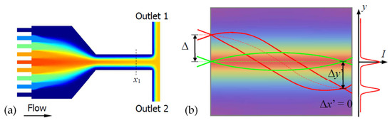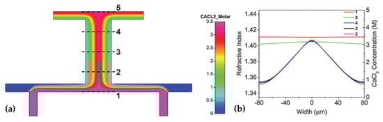Simulated refractive index profile due to the diffusion [42]. (a) Simulated model and distribution graph. (b) Cross-sectional refractive index distribution at different locations along the flow direction (1, 2, 3, 4 and 5, as indicated in (a)). Reprinted with permission from Ref. [42]. 2009 Royal Society of Chemistry.