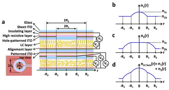 The research of the modal lens has gradually transformed from a single layer to multilayers. The bilayer lens was originally intended to solve the polarization-independent problem, and the specific realization light path diagram was fully elaborated in [46]. In 2019, in order to overcome the dilemma between the tunable range of lens power and the aperture size, Yu-Jen Wang et al. [47] proposed a NLC spatially expanded phase distribution to realize electrically tunable GRIN LC lenses. The lens consists of two LC elements, as shown in Figure 4a. The optical tuning at 0–10 mm is controlled by the upper LC element, and the optical tuning at 10–20 mm is controlled by the lower LC element, and finally achieves 20 mm effective aperture modulation. The individual and combined refractive index profiles are shown in Figure 4b–d. In addition, each LC element can be processed independently, and the focal length of the GRIN LC lens is continuously adjustable. It can be used as a positive lens, a negative lens and a bifocal lens and even has aberration correction function in different spatial positions. In 2020, Kumar, Kang et al. [48] proposed a liquid crystal lens with a three-layer birefringence structure, a layer of uniformly arranged nematic liquid crystal between two PET substrates. The polarization independence is finally achieved by the decomposition of the light beam by the PET layer and the modulation of the extraordinary light by the liquid crystal layer. Subsequent researchers found that the double-layer structure can achieve large aperture and wide tuning of the lens.