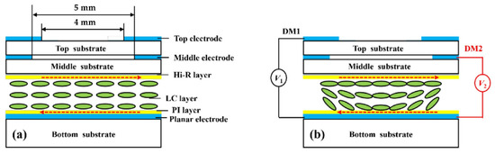 Dual-aperture LC lens at different working states: (a) when the voltage is on and (b) the voltage is off [49]. Reprinted with permission from Ref. [49]. 2022 Elsevier.