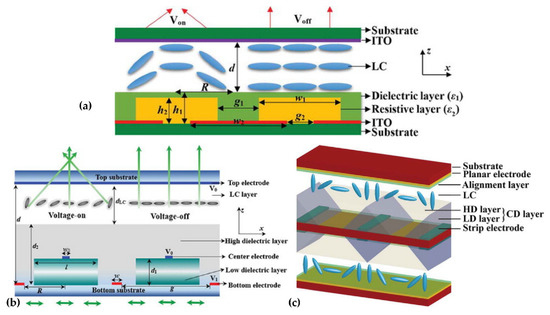 LC lens arrays with different layers: (a) resistive layer [27], (b) low dielectric layer [50] and (c) composited dielectric layer [51]. Reprinted with permission from Refs. [27,50,51]. 2020 Taylor & Francis.