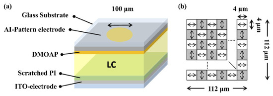 Due to the birefringence characteristics of liquid crystals, the LC device has a certain dependence on the polarization of the incident light, which hinders the tuning of the LC lens and reduces the light efficiency. In order to improve it, polarization-independent or polarizer-free LC phase modulations are developed, including a double-layered structure, residual phase type, a mixed type (i.e., combination of a double-layered structure and residual phase type) and the type of Kerr effect. However, the two-layers structure must be identical, which is not easy in mass production, and there is also a trade-off between it and the response time. In 2021, Yi-Hsin Lin et al. [53] proposed a novel LC mode for a polarization-independent LC phase modulation by means of orthogonally anisotropic orientations of nematic LC on adjacent microdomains in a single LC layer through the scratched method. Each subdomain is 4 μm, and the total size is 112 μm (Figure 7a). Such an orthogonal (Figure 7b) nematic LC mode includes a subdomain with anisotropic orientations but collectively presents a capability of a polarizer-free optical phase modulation. An OLC mode cell provides a tunable optical phase of 3.35π radians for unpolarized light and different linearly polarized light. A polarizer-free LC micro-lens is also presented.