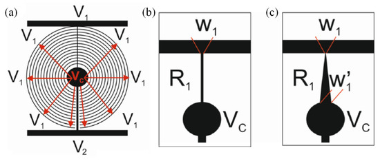 Additionally, based on the multi-ring electrode structure, in 2020, J.F. Algorri et al. [56] designed a voltage-divided multi-ring electrode lens, and the width of the electrode and the gap are both 10 μm. This microstructure is based on two main elements, a transmission line acting as a voltage divider and concentric electrodes distributing the voltage across the active area of the liquid crystal evenly (Figure 8a). The concentric electrodes only make electrical contact with the thinner transmission line (R1), not R2, and the main purpose is to control the voltage distribution between V1 and VC. Compared to the modal techniques, the transmission line has a low resistivity. Different geometries of the transmission line will result in different voltage distributions of the electrode at different radii, forming the lenses with different functions. The uniform transmission line (Figure 8b) can form a tapered lens with a linear distribution of a refractive index, and the tapered transmission line (Figure 8c) can form a GRIN lens with a parabolic refractive index distribution, even a logarithmic lens. The magnitude of the voltages V1 and V2 at both ends can also determine the concave or convex lens. In this paper, it is verified that a 1 cm aperture GRIN liquid crystal lens can achieve a focal length variation range of 5.8 D through experiments.