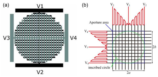 Using the same structure and idea of a transmission line voltage divider, J.F. Algorri et al. [57,58,59] modified the concentric ring electrode into strips with periodic distribution, as shown in Figure 9a. By applying four different voltages: V1, V2, V3 and V4 [60,61,62] to the endpoint of the upper and lower layers, six optical devices were realized. Voltages across the same layer had opposite phases. To avoid the cancellation when the amplitudes are equal between the upper and lower layers, a relative phase shift of 90° was applied. When the electrodes of the bottom substrate are grounded (V1 = V2 = 0), Powell lens and cylindrical lens can be realized according to the shape of the transmission line, such as in Figure 8b,c. If four endpoints work at the same time, the refractive index profile will be axisymmetric. The above two lenses convert to axicons and quasi-parabolic lenses, and the effect of the gap between perpendicular electrodes should be discussed, which relate and influence the function of the beam steering and 2D tunable diffraction grating. To achieve steering towards either the vertical or horizontal direction, a single voltage has to be applied at one terminal, whereas the rest have to be grounded. Combined with specific device parameters, the maximum steering range of the device is from −0.08° to +0.08°. In 2022, a novel pattern electrode [63] is designed to produce a parabolic profile of the voltage difference (Figure 9b). It consists of the generating unit (solid lines) and the distributing unit (dashed lines). The lengths of the resistive lines in the generating unit increase linearly from the center to the edges. The distributing unit is composed of many parallel ITO lines. Detailed voltage distribution derivation means that the terminal voltage can be set according to the required lens parameters. The experiment demonstrated that the optical power changes from −11.1 to +11.3 m−1. Some other electrode structures that form parabolic voltage profiles are also demonstrated.