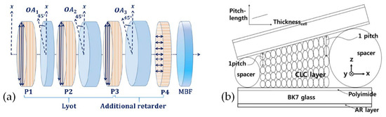 Schematic diagram of (a) LC filter based on a Lyot filter [69] and (b) the wedge CLC cell with a pitch gradient [70]. Reprinted with permission from Refs. [69,70]. 2016 The Optical Society and 2019 IEEE.