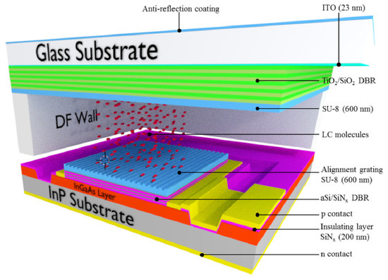 - Levallois, C.; Sadani, B.; Boisnard, B.; Camps, T.; Paranthoën, C.; Pes, S.; Bouchoule, S.; Dupont, L.; Doucet, J.-B.; Alouini, M.; et al. Liquid Crystal-Based Tunable Photodetector Operating in the Telecom C-Band. Opt. Express 2018, 26, 25952. [Google Scholar] [CrossRef]