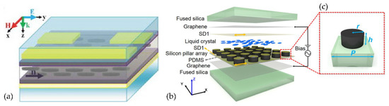 Part of the research on THz–LC devices focuses on the design of metamaterial structures. Rafał Kowerdziej et al. [74] designed a subwavelength 25 nm-thick titanium split-ring resonator (SRR) planar square array to realize a tunable dual-band near-infrared metamaterial absorber using a combination of high-birefringence liquid crystals and high-loss metals (Figure 13a). Due to the high optical loss of Ti, perfect absorbance of over 99.4% was obtained at 328 THz and 364 THz. Furthermore, the absorption bandwidth is extended by the generated PSP resonance at the Ti-LC interface. The absorbance exceeds 70% over a broad spectral range of 318–372 THz, and spectral tunability up to 8 THz is achieved by simply switching the liquid crystal alignment wavelength. Shenghang Zhou et al. [76] proposed a tunable dielectric metamaterial absorber in the terahertz (THz) range. The absorber is composed of a silicon pillar array embedded in a liquid crystal (LC) layer, which is sandwiched by two graphene electrodes (Figure 13b,c). By way of varying the applied bias, the LC orientation can be continuously tuned. Structures such as single-layered fishnet metamaterial by Wei-Chih Wang [77] and keyhole-like metamaterial by Jun Yang [78] have also been proposed and tested.