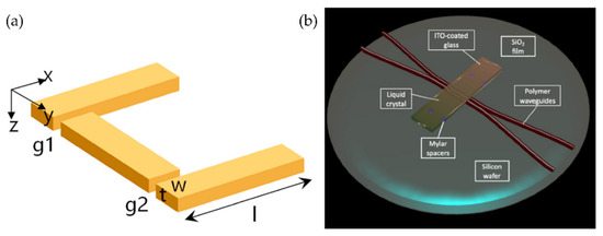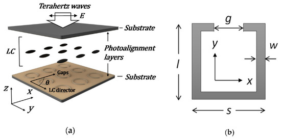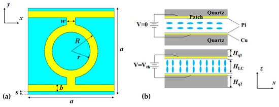 Schematic diagram of a metamaterial absorber based on liquid crystals [80]: (a) top view and (b) side view. Reprinted with permission from Ref. [80]. 2018 MDPI.