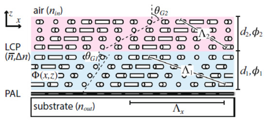 - Xiang, X.; Kim, J.; Escuti, M.J. Bragg Polarization Gratings for Wide Angular Bandwidth and High Efficiency at Steep Deflection Angles. Sci. Rep. 2018, 8, 7202. [Google Scholar] [CrossRef]