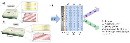 - Yin, K.; Lee, Y.-H.; He, Z.; Wu, S.-T. Stretchable, Flexible, Rollable, and Adherable Polarization Volume Grating Film. Opt. Express 2019, 27, 5814. [Google Scholar] [CrossRef] [PubMed]