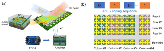 - Liu, C.X.; Yang, F.; Fu, X.J.; Wu, J.W.; Zhang, L.; Yang, J.; Cui, T.J. Programmable Manipulations of Terahertz Beams by Transmissive Digital Coding Metasurfaces Based on Liquid Crystals. Adv. Opt. Mater. 2021, 9, 2100932. [Google Scholar] [CrossRef]