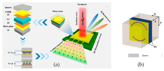 - Fu, X.; Shi, L.; Yang, J.; Fu, Y.; Liu, C.; Wu, J.W.; Yang, F.; Bao, L.; Cui, T.J. Flexible Terahertz Beam Manipulations Based on Liquid-Crystal-Integrated Programmable Metasurfaces. ACS Appl. Mater. Interfaces 2022, 14, 22287–22294. [Google Scholar] [CrossRef]
