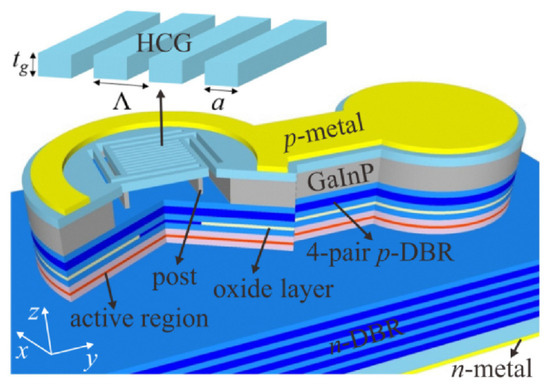 - Zhang, J.; Hao, C.; Zheng, W.; Bimberg, D.; Liu, A. Demonstration of Electrically Injected Vertical-Cavity Surface-Emitting Lasers with Post-Supported High-Contrast Gratings. Photonics Res. 2022, 10, 1170. [Google Scholar] [CrossRef]