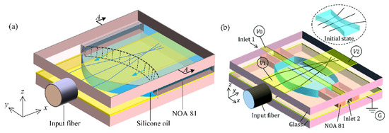 - Liang, Z.; Ding, W.; Zhao, R.; Huang, Y.; Kong, M.; Chen, T. Design and Characteristics of an Optofluidic Phase Modulator Based on Dielectrowetting. Langmuir 2021, 37, 769–773. [Google Scholar] [CrossRef] [PubMed]