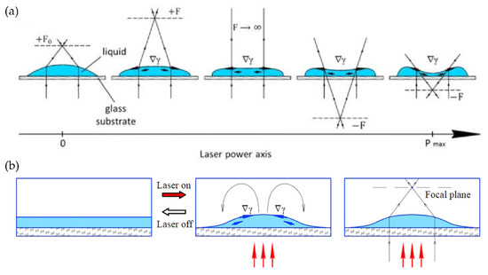 - Malyuk, A.Y.; Ivanova, N.A. Varifocal Liquid Lens Actuated by Laser-Induced Thermal Marangoni Forces. Appl. Phys. Lett. 2018, 112, 103701. [Google Scholar] [CrossRef]