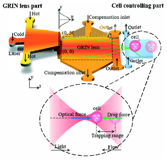 - Liu, H.; Shi, Y.; Liang, L.; Li, L.; Guo, S.; Yin, L.; Yang, Y. A Liquid Thermal Gradient Refractive Index Lens and Using It to Trap Single Living Cell in Flowing Environments. Lab Chip 2017, 17, 1280–1286. [Google Scholar] [CrossRef]