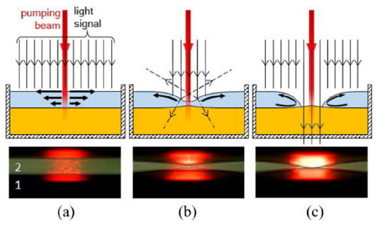 For the optical device based on the interface control, the refractive index distribution of the liquid is uniform, and there is no gradient distribution. However, based on the refractive index gradient distribution, many optical devices with better characteristics can be produced. For example, the Luneburg lens has better light focusing and aberration, and the gradient fiber can self-focus to increase the transmission distance. The first GRIN lens based on diffusion was demonstrated in [42] (see Figure 3a,b), which provides a new strategy for developing liquid microlens.
