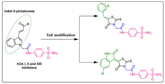 The synthesis of rhodanine derivatives and exploring their potential inhibitory actions against various diseases are popular areas of research. Unfortunately, few efforts have been made to investigate the potential of rhodanine derivatives as hCA inhibitors [7,8,9]. Hence, in the present study, we synthesized and investigated a novel series of benzenesulfonamide-linked rhodanine derivatives for their inhibitory effects on hCA isoenzymes. Moreover, to better explore the chemical space within this privileged scaffold and to take advantage of the good inhibitory potency displayed against hCA I, II, and XIII by indole-linked benzenesulfonamide derivatives [25,26,27,28,29], we designed our derivatives functionalizing the rhodanine nucleus with both aryl and isatin rings (tail approach) to orient the isoform selectivity against four different hCA isoforms. Hence, the target compound was developed from indol-3-ylchalcone-linked benzenesulfonamide (which was previously synthesized in our lab) where the indol-3-ylchalcone moiety was replaced with rhodanine-linked aldehydes or isatins (Figure 1) in order to keep the presence of a nitrogen in this portion of the scaffold constant or not constant.