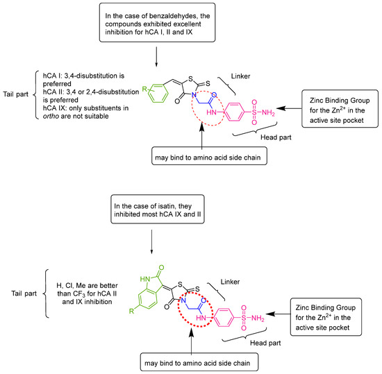 The molecules displayed selectivity towards hCA IX and XII compared to hCA I and II. The structure–activity relationships (Figure 2) showed that regardless of whether the molecules bared electron-donating or electron-withdrawing groups, they exhibited good inhibition. However, it was also observed that the molecules with aryl rings (7a–u) or isatins (9a–d) showed good inhibition for specific isoforms.