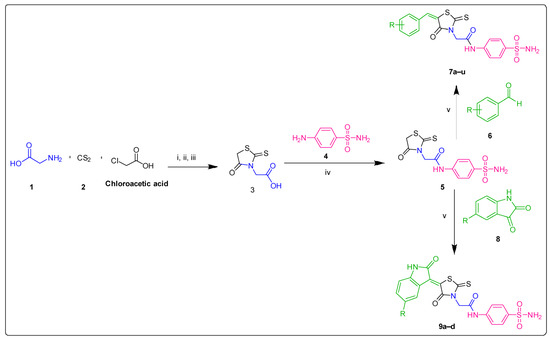 The target molecules were designed using the tail approach as depicted in Scheme 1. The reactions involved the commercially available starting materials glycine (1) and chloroacetic acid (2). The intermediate 3, (2-(4-oxo-2-thioxothiazolidin-3-yl)acetic acid) was obtained via the one-pot, three component condensation of glycine, chloroacetic acid, and carbon disulfide by using a method identified in past literature [30]. The rhodamine-containing intermediate 3 (2-(4-oxo-2-thioxothiazolidin-3-yl)acetic acid) was then subjected to acid-amine coupling with sulfanilamide (4), according to a previously reported procedure [31], to produce intermediate 5, which was further functionalized through Knoevenagel condensation [32] with the appropriated carbonyl compound (benzaldehydes (6) and isatins (8)) to produce the target compounds 7a–u and 9a–d, respectively, in good to excellent yield.