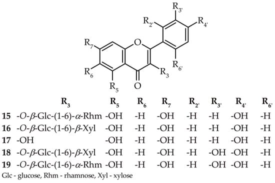 A detailed study of chloroform extract, as well as ethyl acetate and n-butanol fractions from the H. palustris herb, led to the isolation of eleven compounds. These were identified as 5,6,2′,6′-tetramethoxyflavone (zapotin) (8), 5,2′-dihydroxyflavone 2′-O-β-glucopyranoside (9) 5,6-dihydroxyflavone 6-O-(6″-O-glucopyranosyl)-β-glucopyranoside (hottonioside A) (10), 5,2′-dihydroxyflavone (11), 5,6-dihydroxyflavone (12), 5,7-dihydroxyflavone (chrysin) (13), apigenin 7-O-(2″-O-β-glucuronide)-β-glucopyranoside (14), kaempferol 3-O-(6″-O-α-rhamnopyranosyl)-β-glucopyranoside (nicotiflorin) (15), kaempferol-3-O-(6″-O-β-xylopyranosyl)-β-glucopyranoside (16), kaempferol (17), quercetin 3-O-(6″-O-β-xylopyranosyl)-β-glucopyranoside (18), and quercetin 3-O-(6″-O-α-rhamnopyranosyl)-β-glucopyranoside (rutin) (19) (see Figure 1 and Figure 2). Moreover, evidence of the structures of compounds 9, 10, 14 was discovered for the first time. Notably, compounds 16 and 18 were characterized in meticulous detail for the first time.