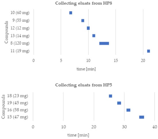 The HP8 extract (7 g) was dissolved in the necessary volume of methanol:DMSO solution (9:1) and then fractionated on a self-packed SPE column with C18-modified silica gel. Elution was performed with a water–methanol mixture in 4 steps (25%, 50%, 75%, and 100% methanol, 300 mL per step). Based on the HPLC analysis, fraction 3 (75%) was selected for isolation by the preparative HPLC technique. This process provided the following compounds: 10 (60 mg, tR = 6.5–7 min), 9 (55 mg, tR = 8.75–9.25 min), 12 (12 mg, tR = 9.75–10.25 min), 13 (14 mg, tR = 10.75–11.25 min), 8 (120 mg, tR = 12–13.75 min), and 11 (19 mg, tR = 20.75–21.25 min). In a subsequent step, the obtained eluate was reduced under vacuum and recrystallized (water:ethanol (5:95, v/v)). The HP5 fraction was dissolved in a mixture of 10% methanol and then subjected to a self-packed C18 SPE column (25 g). Elution was carried out with a mixture of water (A) and methanol (B), with the B content increasing in steps (10–100% B, 200 mL per step). Based on the HPLC analysis, the combined fractions of 2–3 (20–30%) constituted a homogeneous component of 14 (108 mg) with >98% HPLC purity. After being eluted out in succession, fractions 4–5 (40–50%) were combined and selected for further purification using preparative HPLC. Pooled eluates were evaporated from residual organics and lyophilized to yield homogeneous compounds labeled compounds 18 (23 mg, tR = 25–26 min), 19 (45 mg, tR = 27.75–29 min), 16 (58 mg, tR = 30.75–32 min), and 15 (47 mg, tR = 35–36.5 min). The elution time windows of the compounds and their yields (mg) are shown in Figure 4.