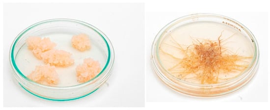 Another rare medicinal plant from which both hairy roots and undifferentiated cells were obtained was Rhodiola quadrifida Pall. (Crassulaceae), known for its medicinal properties [,,]. It belongs to the alpine species and its range is rapidly shrinking []. It should be pointed out that the content of the main metabolites (salidroside and rosavin) was higher in undifferentiated callus cultures than in hairy roots []. The results are of considerable interest for further research.