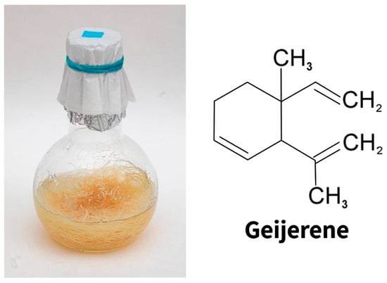 Intensively branching genetically transformed roots forming a large number of root apexes turned out to be a convenient object for studying the function of the so-called border cells, which are root cap cells that separate from the root tip during its growth. They are the first to come into direct contact with various representatives of the rhizosphere. Hairy roots of common rue retain the ability to synthesize the essential oil typical of intact plant roots, the main component of which is sesquiterpene geijerene []. Interestingly, geijerene (Figure 3) belongs to the number of root-specific volatile metabolites that attract entomopathogenic nematodes eating the larvae of a dangerous root pest of young citrus plants (Rutaceae), the weevil Diaprepes abbreviate [].