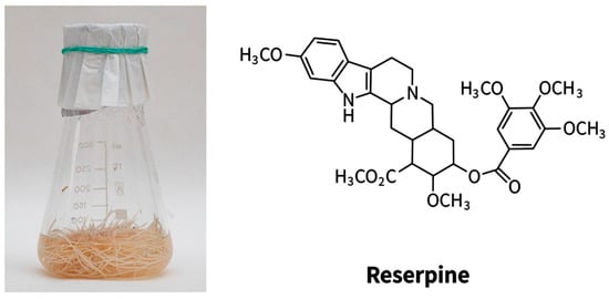 Rauwolfia serpentina Benth. (Apocynaceae) has pronounced pharmacological properties. The main use of R. serpentina was for snake and insect bites, fever, cholera, diarrhea, as a mild sedative for children, and in Java, it was used as an anthelmintic [,,]. To date, it has been shown that Rauwolfia serpentina has antibacterial [], antifungal [], anti-inflammatory [], antidiabetic, mosquito larvicidal, antihistamine, antidiarrheal [], hypoglycemic and hypolipidemic, anticancer, as well as sedative [] and hepatoprotective activities [,]. Currently, more than 80 alkaloids have been isolated from this plant []. However, reserpine is a pharmacologically more potent alkaloid []. On the basis of Rauwolfia serpentina alkaloids, the drug “Reserpine” against arterial hypertension and “Ajmalin”—an antiarrhythmic agent was released. The hairy roots of Rauwolfia serpentina were obtained in 1990 and are cultivated to the present (Figure 5).