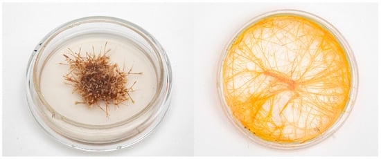 After, hairy roots of Ruta graveolens L. (Rutaceae) were obtained (Figure 3). Ruta graveolens (common rue, rue) is a plant with a very rich composition of secondary metabolites (about 200) belonging to various groups of low molecular weight compounds []. Ruta graveolens contains coumarins, alkaloids, volatile oils, flavonoids, and phenolic acids []. Rue has been known as a medicinal plant since ancient times. It has already been used to treat various diseases since the time of Hippocrates []. There are numerous reports on the use of rue herbs in the folk medicine of various countries, namely, in Indian and Chinese medicine. Rue has been used for a long time as an analgesic, to eliminate eye problems, and to improve the condition of patients with rheumatism and dermatitis [,]. In Russian folk medicine, it was used for heart diseases, disorders of the nervous system, and as an effective abortifacient []. Currently, the antiviral, antibacterial, and fungicidal effects of rue have been proven []. Along with pronounced pharmacological properties, rue is also used as an essential oil plant. Rue essential oil finds application in the perfumery and food industry [].