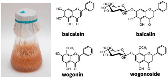 The genetic stability of hairy roots and their ability to maintain the synthesis of low molecular weight metabolites under in vitro conditions at the level of the roots of the whole plant formed the basis for studies conducted with the roots of valuable medicinal plants of the genus Scutellaria. The roots of Baikal skullcap, which have been steadily growing for more than 25 years, synthesize flavones typical of the roots of this plant—glucuronides: baicalin and wogonoside, and aglycones: baicalein and wogonin [,,,,] (Figure 7).
