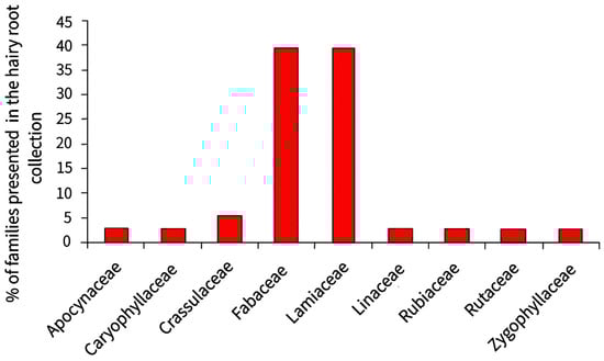 The collection mainly maintains hairy roots of medicinal plant species (84%), and the two families that are predominantly represented are Fabaceae and Lamiaceae (Figure 8).