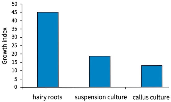 The biotechnology of higher plants developed in the middle of the last century. Biotechnology in most cases is understood as an application of callus and suspension cultures, which, as a rule, are combined under the general name “tissue culture”. The first patent for the production of substances using plant tissue culture was obtained in 1956 []. Even today, the greatest number of publications is devoted to the direction associated with the use of in vitro cultured cells, namely, undifferentiated cultures. Numerous reviews discuss the production of metabolites important for humans from suspension and callus cultures [,,,]. Some authors have noted that the content of secondary metabolites in the resulting suspension and callus cultures was higher than in intact plants [,,]. However, the opposite result was obtained in most cases [,,,,,]. Difficulties arise during large-scale cultivation due to the instability of the synthesis of substances by undifferentiated cultures in a liquid medium [,]. In addition, the synthesis of some pharmacologically important substances may not be possible in undifferentiated cultures [,]. In this regard, attention is drawn to differentiated cultures: shoots, adventitious, and hairy roots (transformed roots). Adventitious roots are induced on media with high auxin and low cytokinin content. However, despite the studies that showed the promise of using adventitious [,,] (untransformed) roots, most studies noted the disadvantages of their use, primarily slow growth and termination of the synthesis of target substances [,]. On the contrary, hairy roots have rapid growth on a hormone-free medium and a high and stable synthesis of essential substances, which has been repeatedly shown [,,,,,,,]. Therefore, the technology of hairy roots is very promising.