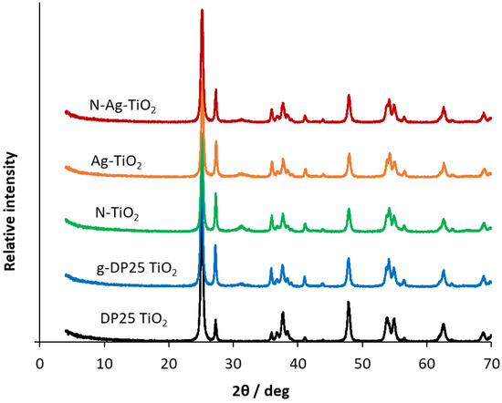 XRD measurements were carried out to determine the phase composition and the crystallite size of the pristine and mechanochemically modified DP25 TiO2 photocatalysts. In the sample names, “g” designates the ground (i.e., mechanochemically treated) DP25 to distinguish it from the untreated DP25. N and Ag in the names indicate doping with these elements (by mechanochemical treatment). The XRD patterns obtained for the catalysts samples studied are shown in Figure 2. The diffractograms were evaluated by using the 00–021-1272, 00–021-1276, 00-029-1360 Powder Diffraction File (PDF) of ICDD (International Centre for Diffraction Data) of anatase, rutile, and brookite, respectively. Figure S1 indicates the identification and quantification of the individual phases in samples DP25 and Ag-TiO2.