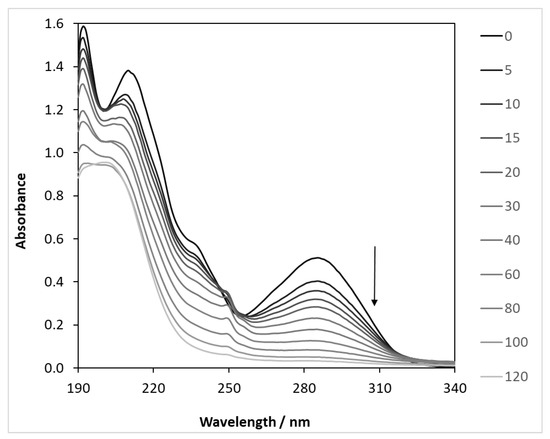 The light absorption spectra of CBZ show two characteristic bands with maxima at 213 and 285 nm. By plotting the spectral variations in the illuminated samples, it can be clearly seen that the absorbance decreases at both wavelengths (Figure 4). The absorbance values measured at 285 nm were converted to concentration using a calibration curve, plotted as a function of the illumination time (Figure S6), and compared with the values determined by HPLC analysis.