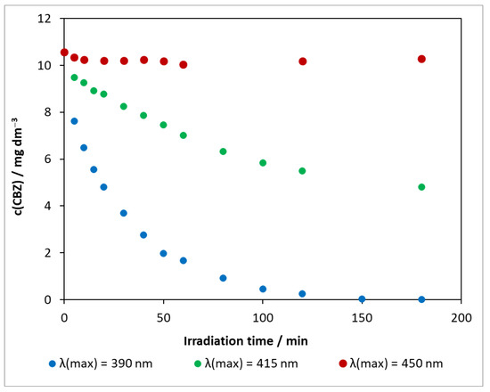 The results obtained for the photocatalytic degradation of carbamazepine on DP25 TiO2 at various light sources are compared in Figure 5. Using the visible-light source of λ(max) = 450 nm, the concentration change in the presence of the Degussa P25 catalyst was minimal, and, during 3 h of exposure, was only 0.54 mg dm−3. Increasing the excitation light energy also increased the decomposition rate. When irradiated with an LED at λ(max) = 415 nm, the conversion was close to 50% in 3 h. Under UV light, the concentration of the model compound decreased to near the limit of detection in only 2 h. As observed in photolysis, the pH change was highest for the light source of λ(max) = 450 nm with ΔpH = 0.80, whereas, for the other two light sources, ΔpHλ(max)= 390 nm = 0.60 and ΔpHλ(max) = 415 nm = 0.65.