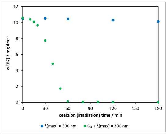 As shown in Section 2.2.1, the concentration of carbamazepine in photolysis did not change significantly during 3 h of illumination (with a decay rate of 1.94 × 10−9 mol dm−3 min−1), even at 390 nm (Figure S5). For comparison, the corresponding points are also depicted in Figure 7. In the presence of ozone under UV irradiation, only a slight change was observed at the beginning; then, the concentration of the test compound decreased rapidly and got below the limit of detection after 60 min. The degradation rate was determined from 20 min onwards, ignoring the initial phase (1.67 × 10−6 mol dm−3 min−1).