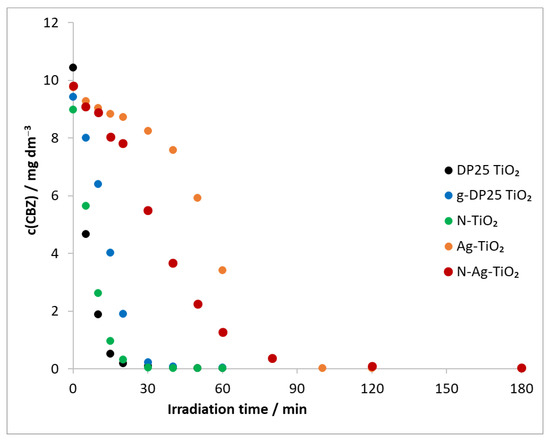 The combined use of two high-efficiency methods (AOPs), heterogeneous photocatalysis and ozonation, was also studied for the degradation of carbamazepine. In order to explore the role of ozone and to determine whether a synergistic effect occurs as reported in several pieces of literatures [51,52,53], experiments in the absence of photocatalysts were also carried out. The transformation of carbamazepine was investigated in the presence of ozone under UV irradiation (Figure 7).