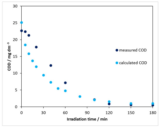In monitoring the processes taking place in redox processes, an important parameter is the chemical oxygen demand (COD), which provides information on the oxidation state of the compounds to be degraded, i.e., whether the system contains any further oxidizable components. The COD values of solutions of carbamazepine at different concentrations were determined to obtain a calibration curve. Using this, the exact concentration of CBZ could be used to determine the COD that carbamazepine would give if it were present in the solution alone (CODCBZ). Figure 9 clearly shows that the COD value measured during the degradation was lower than the corresponding CODCBZ. This means that the oxidation state of the intermediates produced from carbamazepine was higher than that of the parent compound. It can also be seen that the intermediates formed were also gradually transformed and degraded as the reaction proceeded, with virtually no further oxidizable compound in the reaction mixture at the end of the process.
