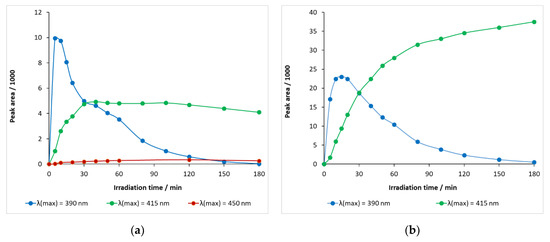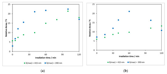 The change in the pH of the solution phase was also monitored. From a nearly identical starting value of 5.42–5.45, the largest increase was observed at visible light ((λmax) = 450 nm, ΔpH = 1.28). This result suggests that the intermediate formed during the minor degradation was basic in character and, thus, caused an increase in pH. The intermediates formed under UV light ((λmax) = 390 nm) were likely to be both acidic and basic in nature, and, therefore, the overall pH change was smaller. In accordance with this tendency, ΔpH was an intermediate value (0.88) at λmax = 415 nm.