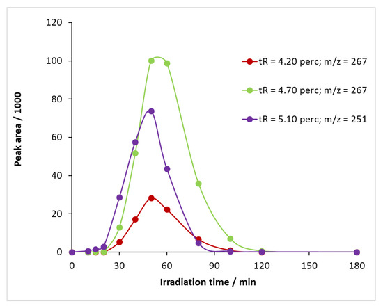When UV illumination was applied in the presence of ozone, not only BQM but also other intermediates were formed from carbamazepine (Figure S13) at retention times of 4.20 and 4.70 min, and the time variation in their sub-peak areas is shown in Figure 11. The m/z value of the compounds detectable at 4.20 and 4.70 min was 267 (Figure S10b,c). By studying the literature, two intermediates can be assigned to this m/z value: 1-(2-benzaldehyde)-(1H,3H)-quinazoline-2,4-dione (BQD) and 1-(2-benzoic acid)-4-hydro-(1H,3H)-quinazolin-2-one (BaQM) (Figure S10d). For the determination of the exact structure of the compounds associated with each retention time, HPLC-MS/MS studies are required, which have not been carried out at this stage of the research.