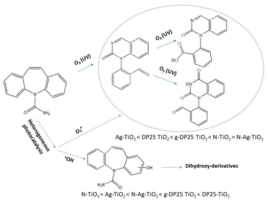 Ozonation as another AOP was also used for CBZ decomposition, completed with the determination of several intermediates formed during this process [51,52]. The main intermediates were BQM (1-(2-benzaldehyde)-4-hydro-(1H,3H)-quinazoline-2-one), BaQM (1-(2-benzoic acid)-4-hydro-(1H,3H)-quinazolin-2-one), BaQD (1-(2-benzoic acid)-(1H,3H)-quinazoline-2,4-dione), and BQD (1-(2-benzaldehyde)-(1H,3H)-quinazoline-2,4-dione).