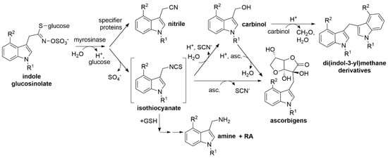 - Agerbirk, N.; de Vos, M.; Kim, J.H.; Jander, G. Indole glucosinolate breakdown and its biological effects. Phytochem. Rev. 2009, 8, 101–120. [Google Scholar] [CrossRef]