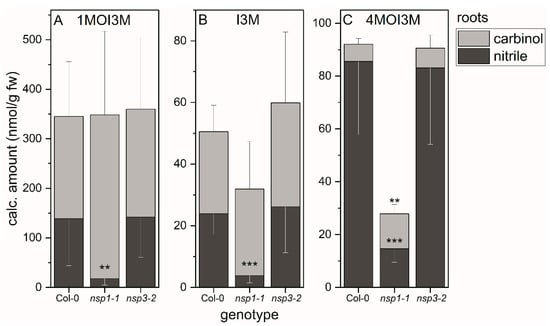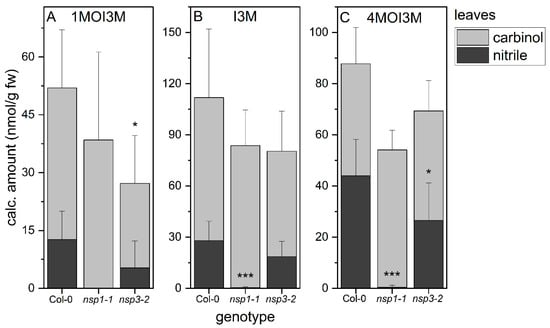 3.4. Indole Glucosinolate Substitution Patterns and NSP Deficiency Affect Indolic Carbinol/Nitrile Proportion in A. thaliana Root Homogenates