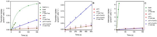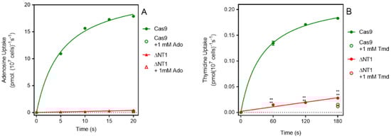 It is well documented that the NT1 transport activity is responsible for the uptake of adenosine and of pyrimidine nucleosides in Leishmania spp. [13,35]. In L. mexicana the Km values for adenosine and thymidine are 0.81 ± 0.16 µM and 11.2 ± 2.4 µM, respectively [36]. We thus assessed the uptake of these two nucleosides in Cas9ΔNT1. Figure 1A shows that the uptake of 0.1 µM [3H]-adenosine by L. mexicana Cas9 promastigotes was very rapid and became non-linear within a matter of a few seconds, with metabolism apparently limiting the rate of uptake. In contrast, the transport of 0.1 µM of [3H]-adenosine by L. mexicana Cas9ΔNT1 promastigotes was virtually abolished and became statistically identical to the uptake in the presence of 1 mM unlabeled adenosine (p > 0.05). We similarly found that the transport of 0.05 µM of [3H]-thymidine was greatly reduced in Cas9ΔNT1 cells compared with L. mexicana Cas9, with a rate of just 0.00004 ± 0.000006 pmol(107 cells)−1 s−1 (Figure 1B), which nonetheless was still significantly different from zero (F-test, p = 0.026), and higher than the saturation control with 1 mM unlabeled thymidine. The abolition of adenosine transport and the near-complete reduction in thymidine transport shows the successful deletion of the NT1 activity.